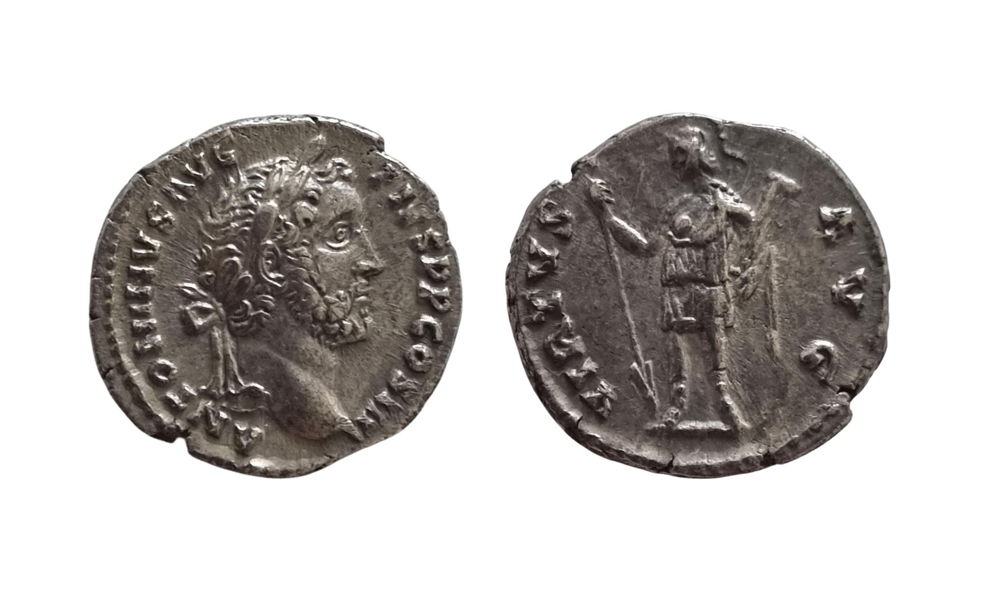 On the reverse the standing figure of Virtus is accompanied by a legend reading VIRTVS AVG. In volume II of David Sear’s Roman Coins and Their Values denarii of this type are listed as number 4138. They were struck at Rome during AD 144.