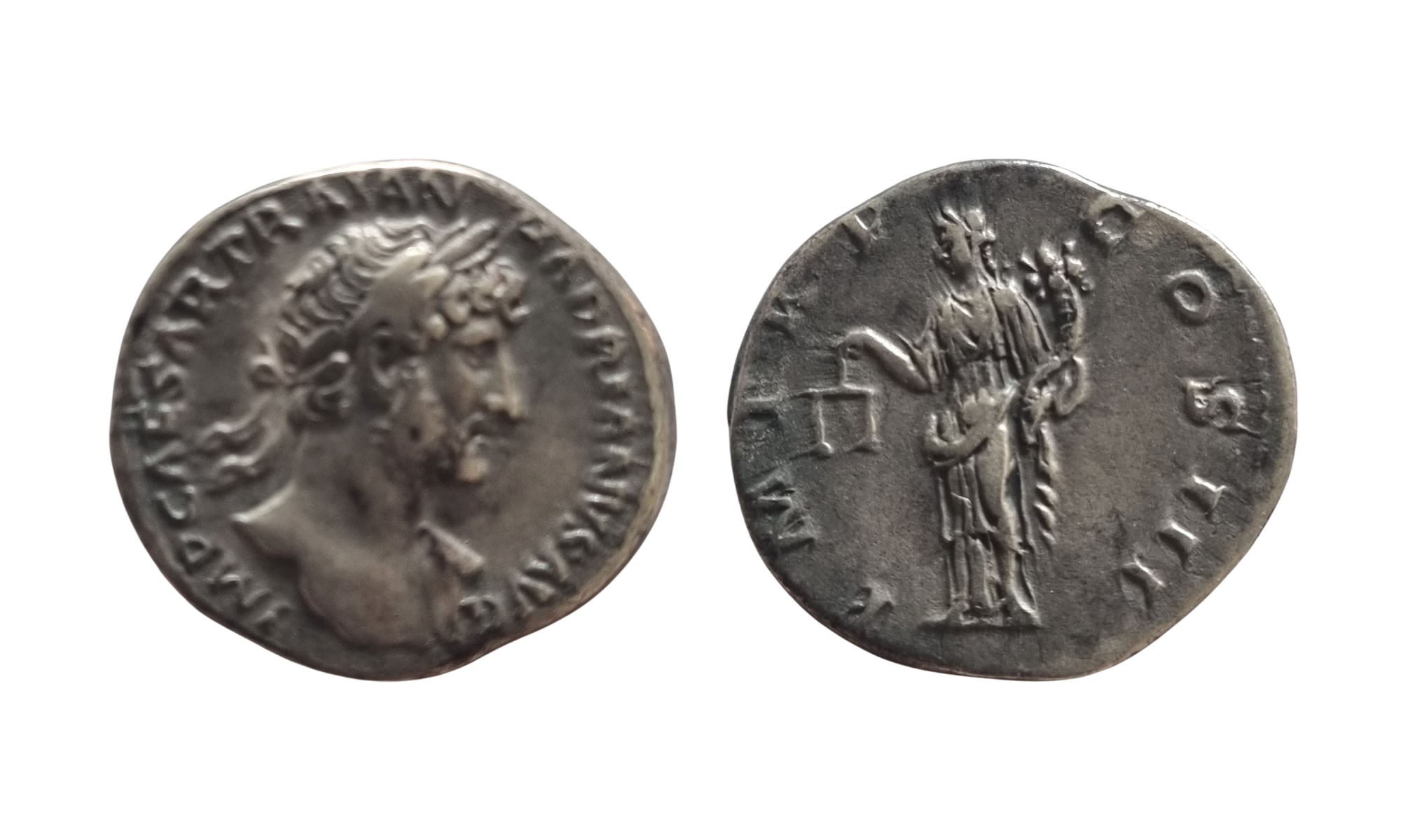 The coin is a denarius of Hadrian, whose dates are AD 117 to 138. On the obverse the legend reads IMP CAESAR TRAIANVS HADRIANVS AVG around the laureate and partly draped bust of the emperor.