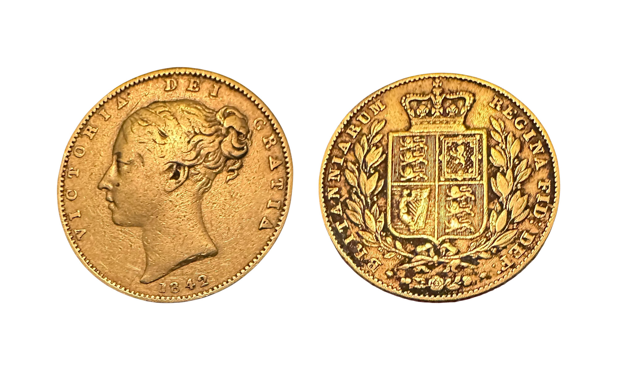 The coin looks to be a perfectly genuine gold half sovereign of Queen Victoria and is dated 1842 on the obverse. It has quite a lot of circulation wear, with the obverse being only Fair and the reverse Fine.