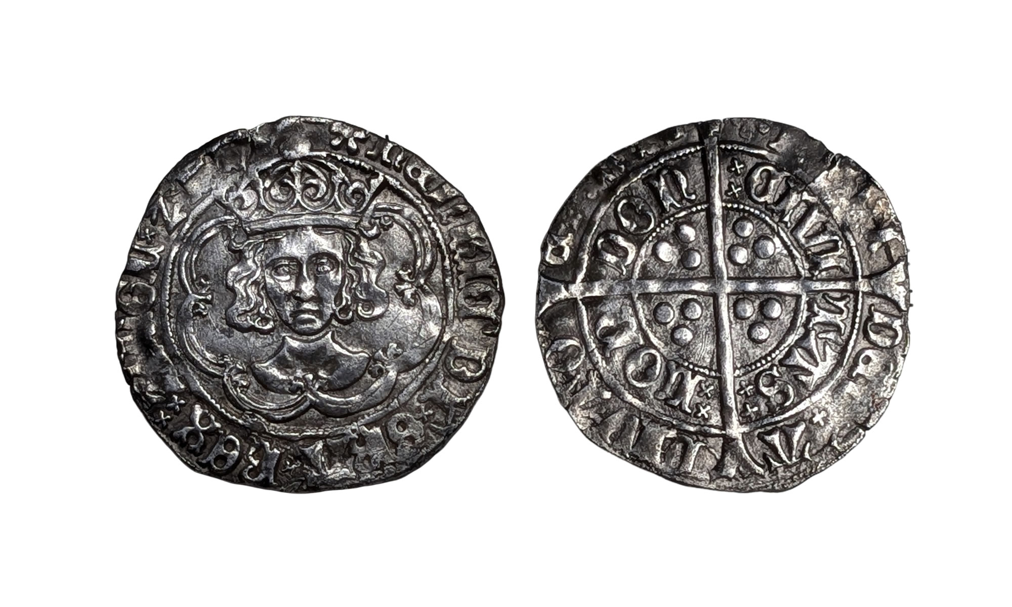 Rob’s find is a London groat of Henry VII. On the reverse there are double-saltire stops before CIVI and LOn and after TAS; this arrangement of stops is unusual. The mint mark on both sides is a pansy. The top arch of the crown does not show up as it is in line with the inner circle but this groat is an example of type IIIc.