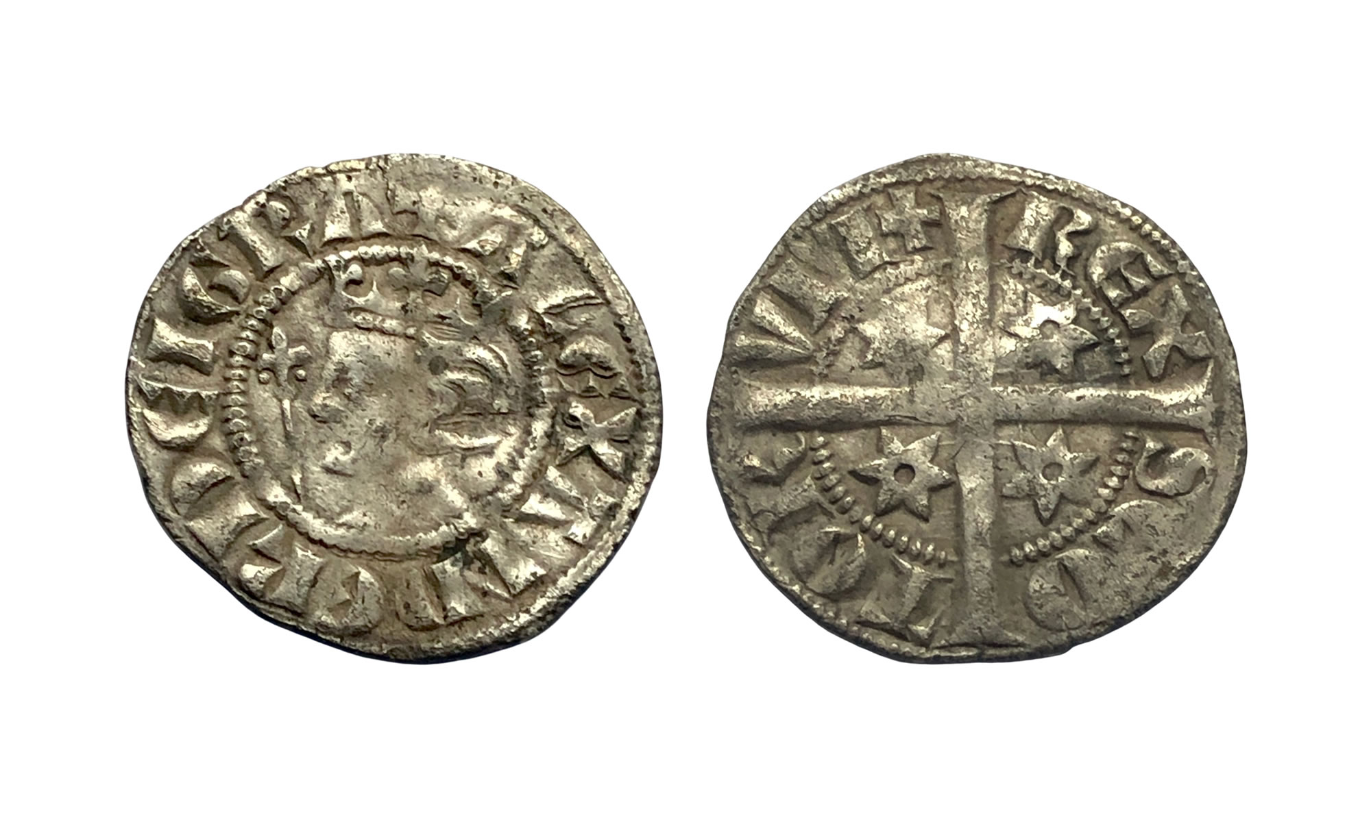 It is certainly Scottish and is a second coinage penny of Alexander III. On the obverse is a right-facing head of the king and the surrounding legend reads +ALEXANDER DEI GRA. On the reverse there are three mullets with six points and one start of seven points in the angles and the legend on this side reads REX SCO TOR VM+.