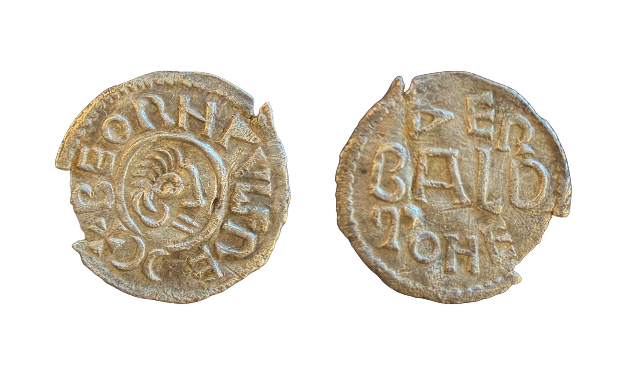 The coin is an Anglo-Saxon silver penny of Beornwulf, who was King of Mercia from 823 to 825 AD. Within the inner circle on the obverse is a crude head of the king facing right.