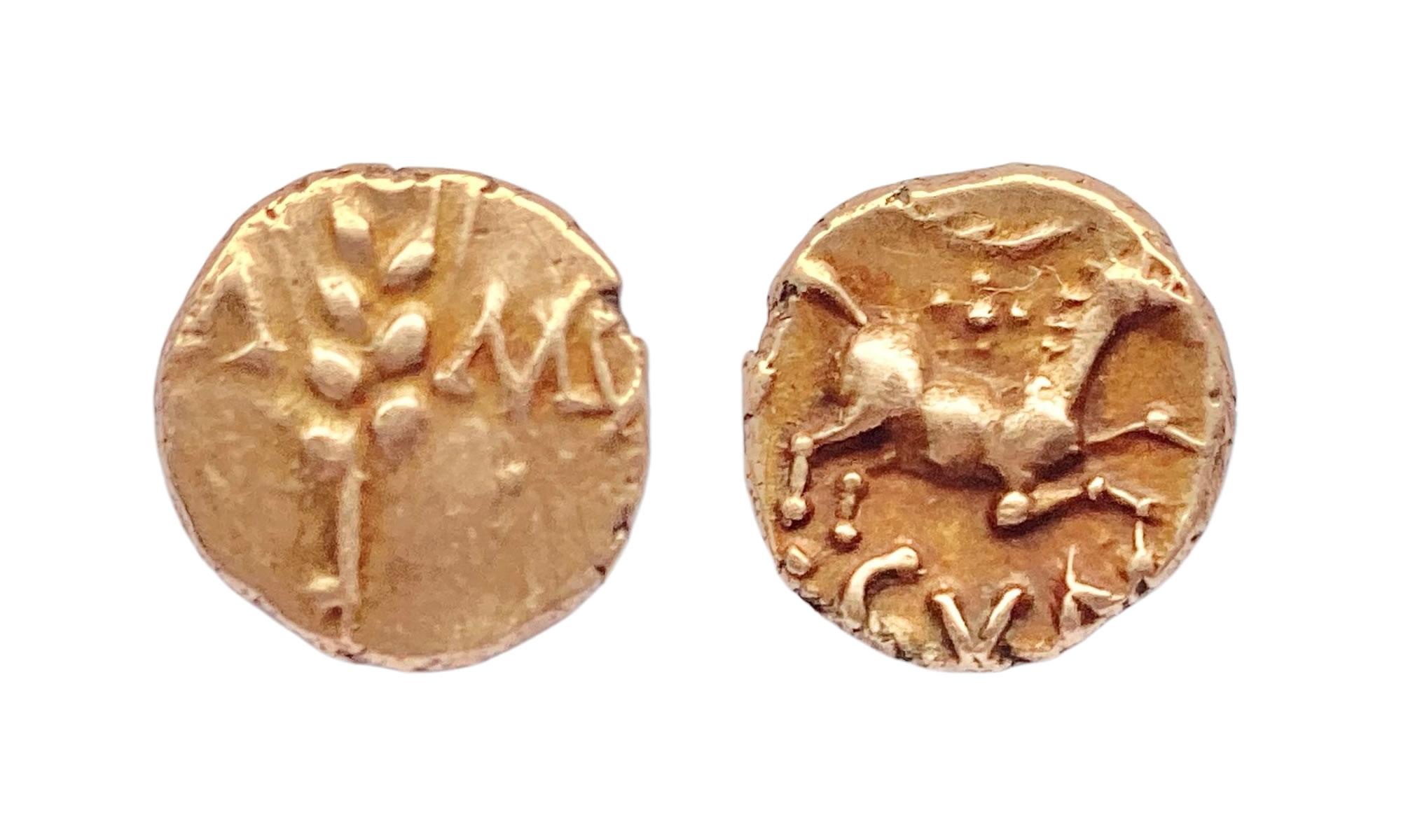 The coin is a quarter stater of the Trinovantes and Catuvellauni. On the obverse is a corn ear with A to the left and MV to the right. On the reverse is a horse facing right with CVN below; above is a large pellet surrounded by five small pellets, one of which is very weak.