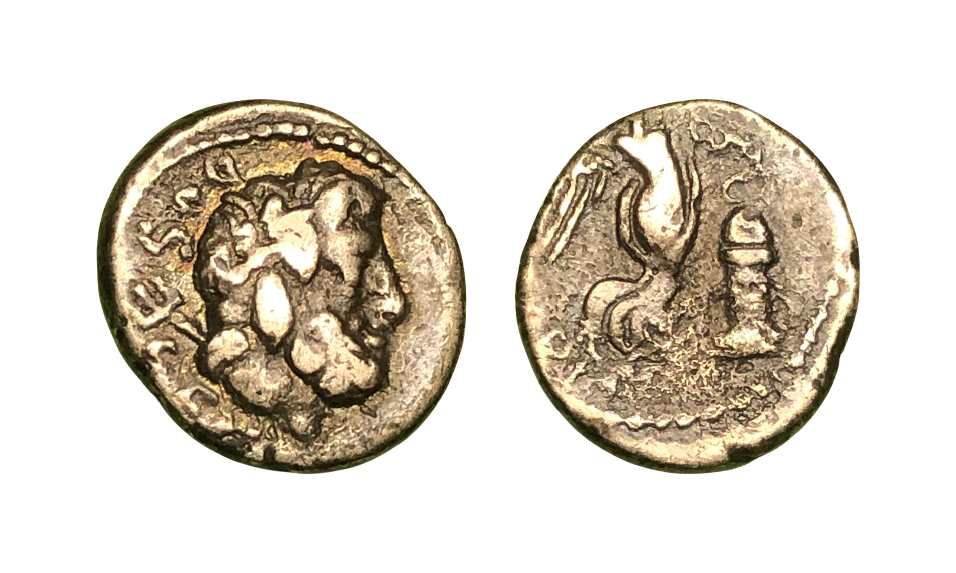 Michael Ruczynski sent in the images of this rather unusual Roman silver coin. At 14mm in diameter, Mike said it was small for a denarius.