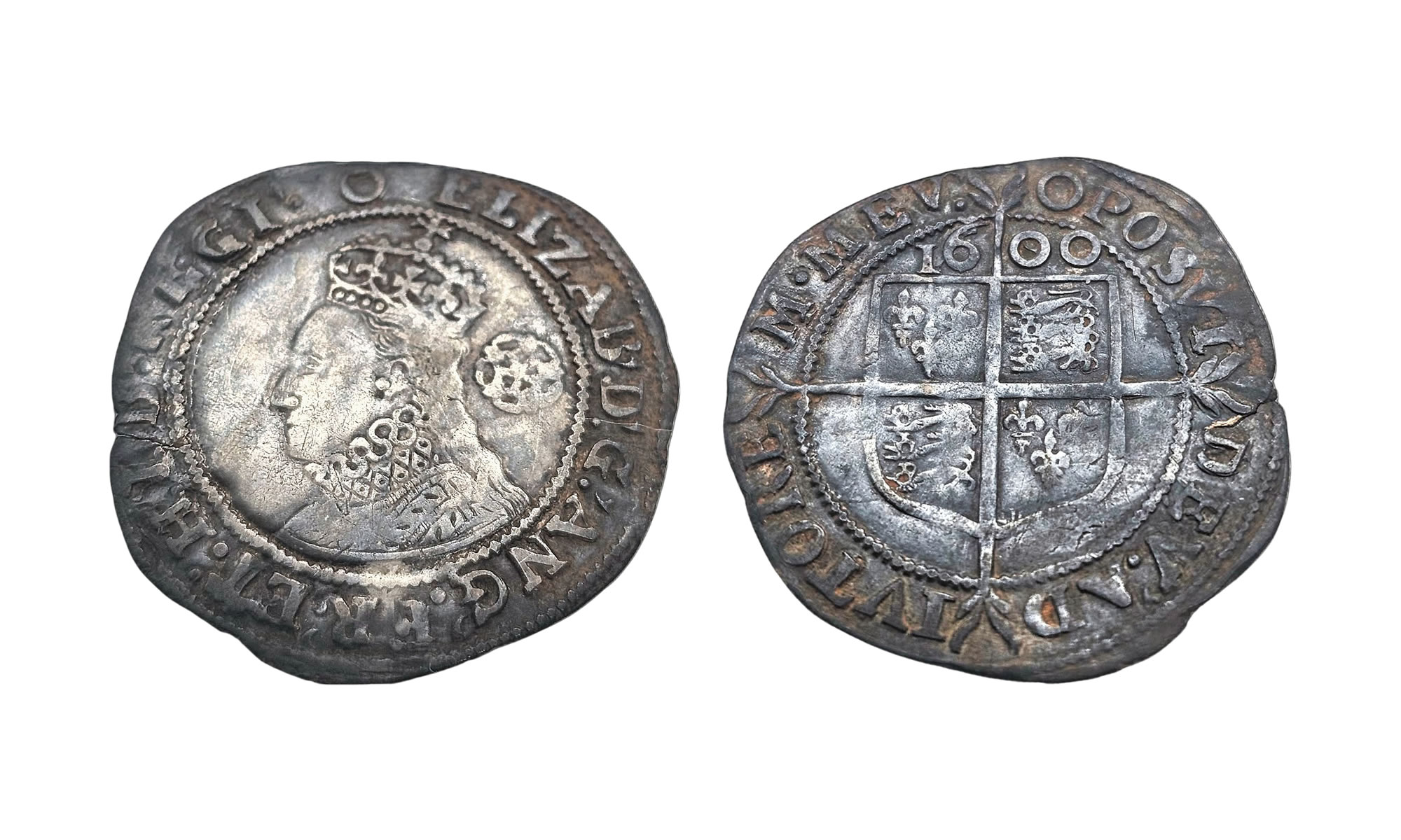 The coin is a sixpence of Elizabeth I. It is dated 1600 on the reverse and the mint mark on both sides is a zero. Interestingly, beneath 600 of the date there are faint vestiges of 599. When the New Year started any dies that were still serviceable would have the date altered; quite often only a single digit would be changed but on the reverse die used to strike this sixpence three digits were over-struck.