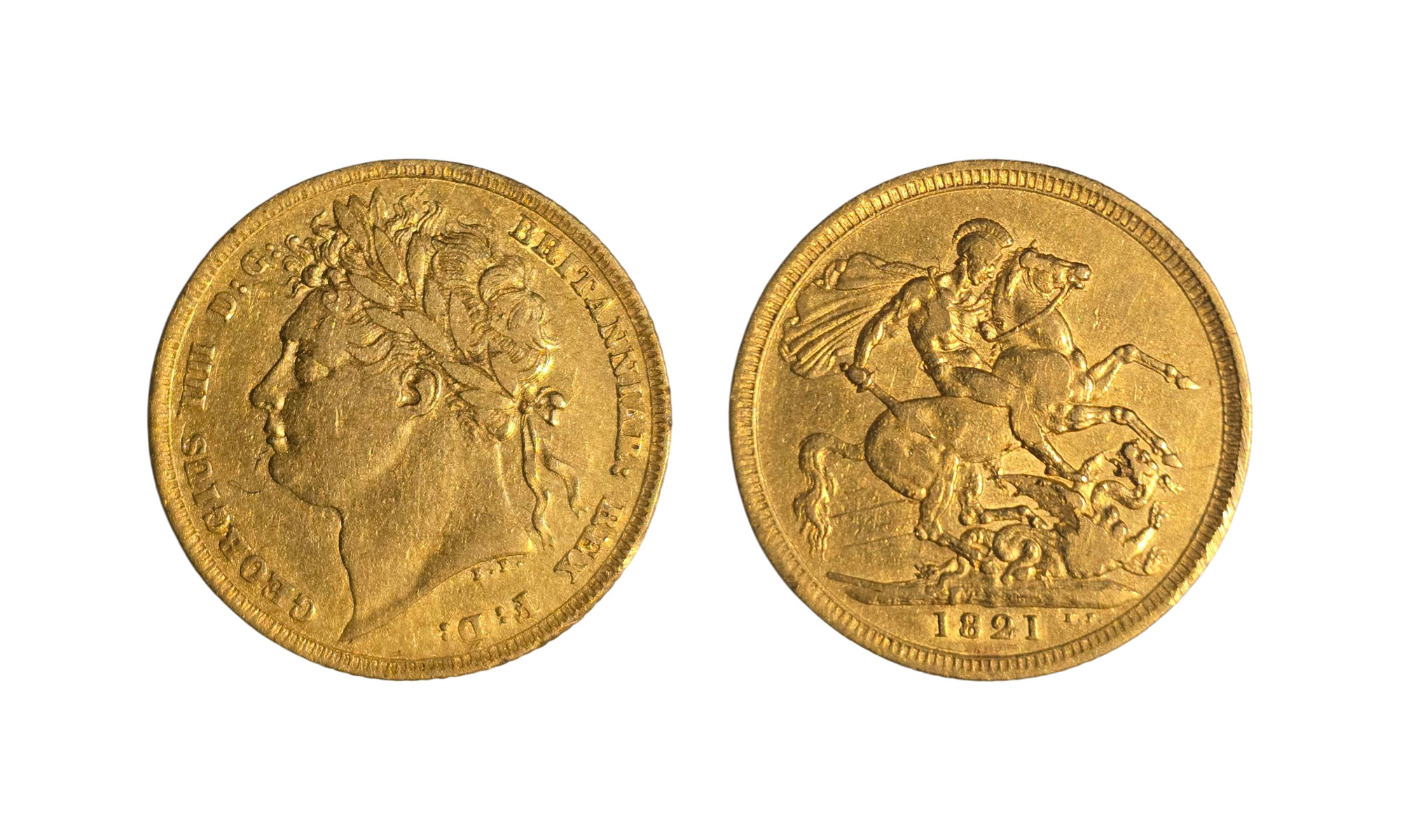 On the reverse, beneath St. George and the Dragon, is 1821, which is the first date to appear on sovereigns of George IV. The design is different to the sovereigns of George III, in that there is no legend on the reverse.