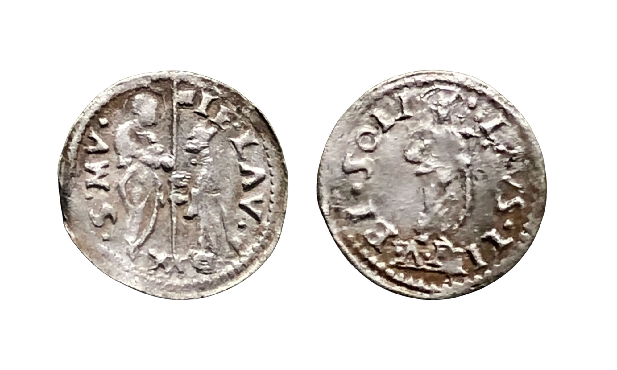 This soldino was struck for Leonardo Loredan between 1501 and 1521, when he was Doge of the Venetian Republic. A very large number of these coins were imported into England and were used as halfpennies. Due to the shortage of small change they circulated widely and specimens turn up quite frequently as detecting finds.
