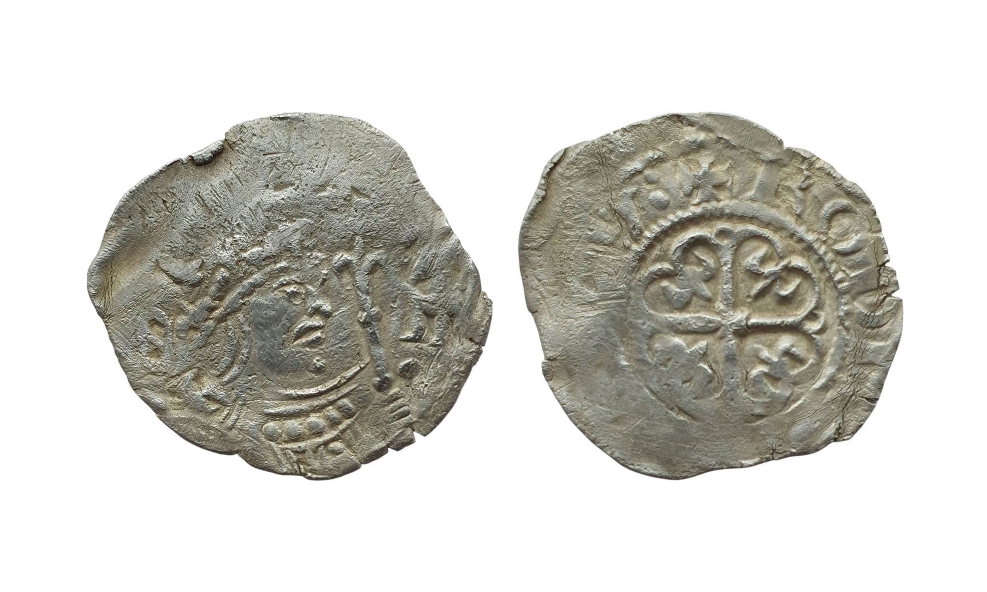 The coin is a Watford type penny of Stephen, who grasped the throne of England late in 1135. None of the legend shows up on the obverse but there is a very attractive portrait of the king. About half of the reverse is flat but the lettering that can be seen reads +ROD——-V:. Therefore, the moneyer is Rodbert and the most likely mint is London.